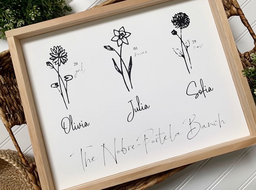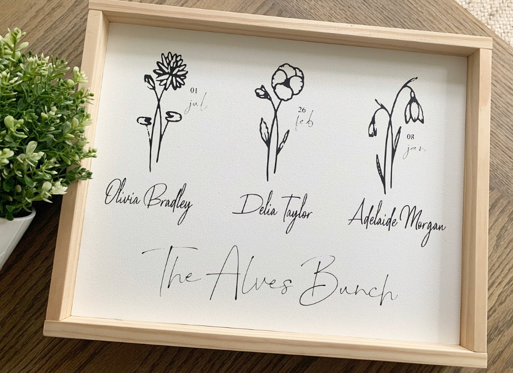 This beautiful sign makes for the perfect gift for new moms, mother's day, birthday or a just because gift. With each child's birth month flower, name and date of birth, any mama would be more than happy to display this beauty in their home.