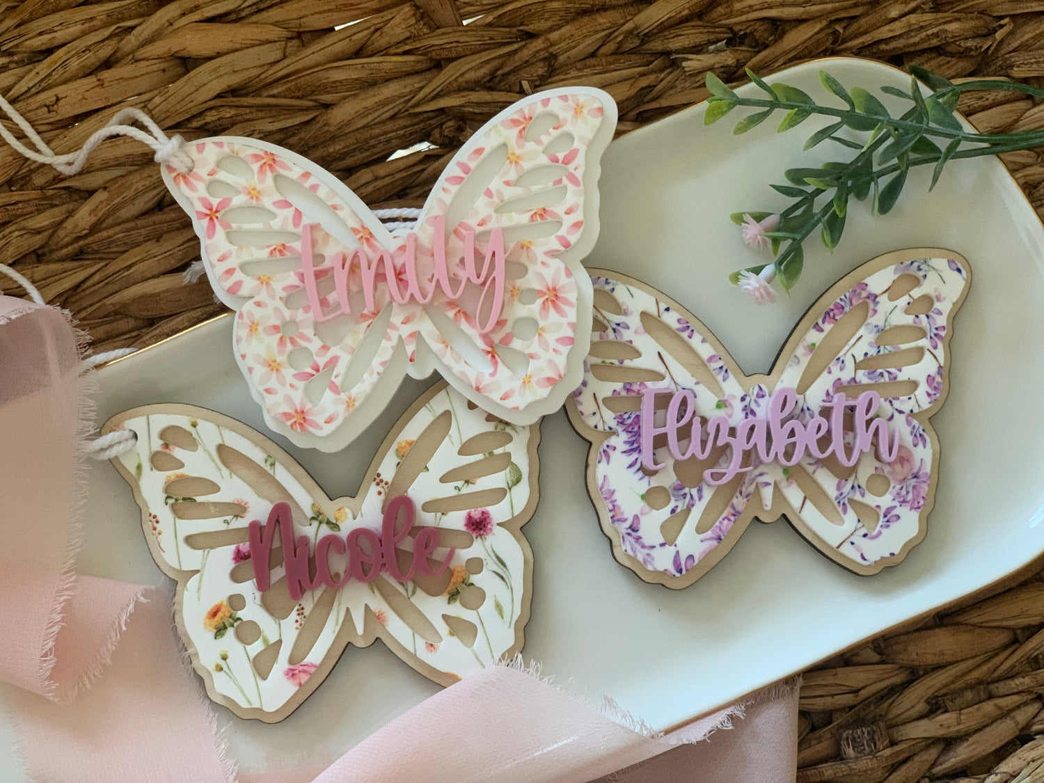 The perfect tag for any occasion. These would be great for Easter baskets, birthday gift tags, backpack tags, table place cards and really anything else you can think of. With their beautiful patterns these butterflies are truly stunning. Choose your favorite pattern, add your personalization and you’re all set. All butterflies have wood backers except for one, (backer in white is made of acrylic)