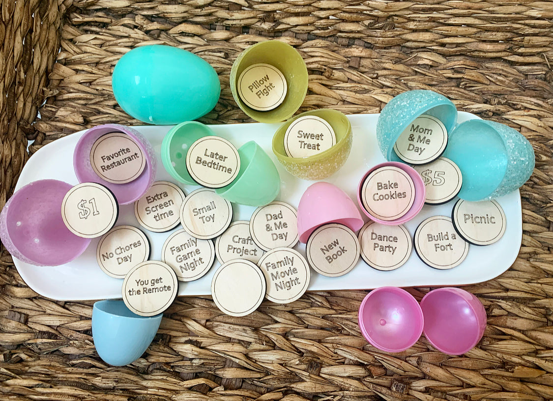 Here’s a fun idea for an Easter egg hunt. Easter tokens! From extra screen time, to a new book, or a day with mommy, these tokens are sure to put a smile on your little ones face. Each set comes with 21 tokens (one of which will be left blank to be filled in by you.)