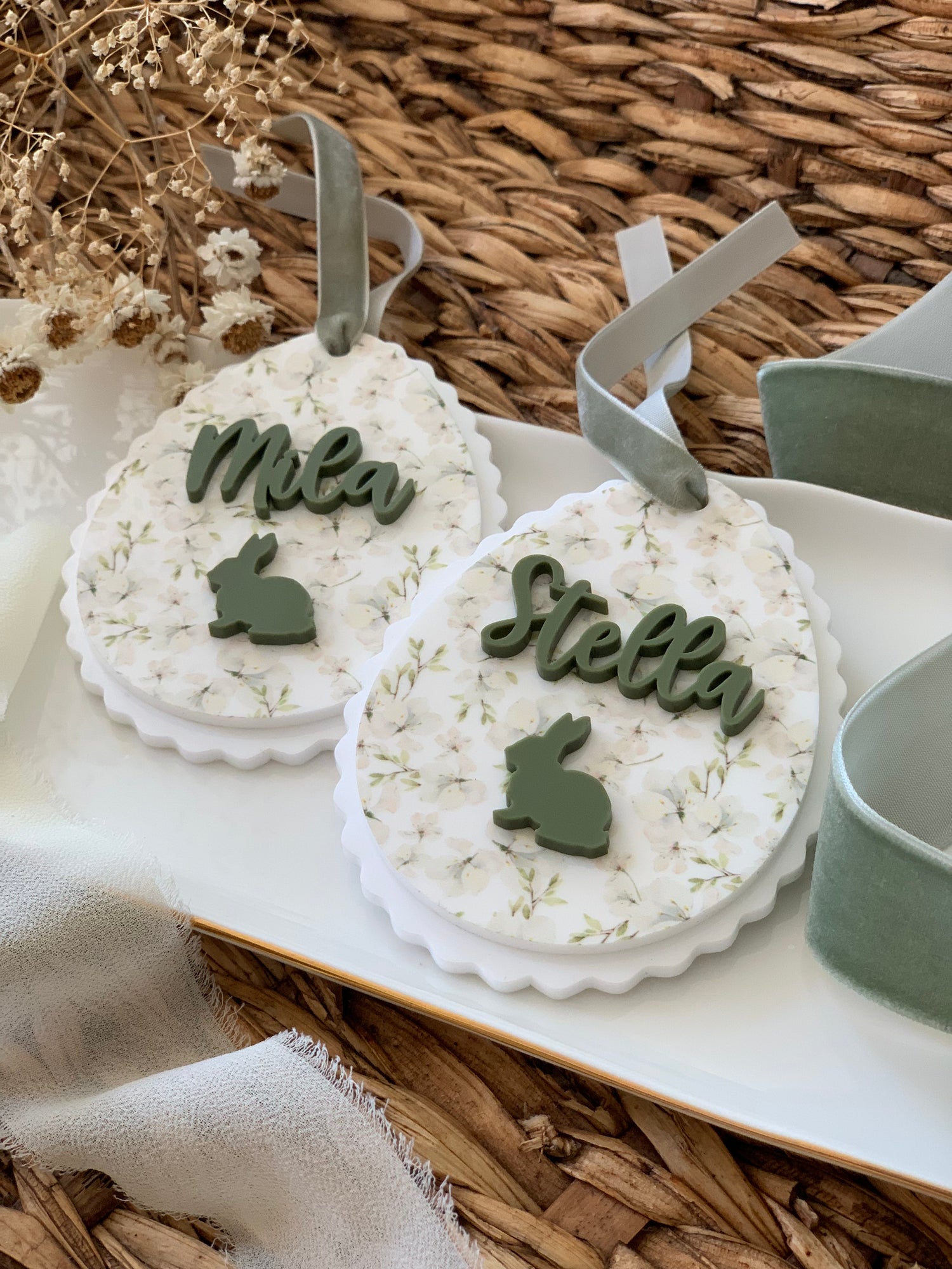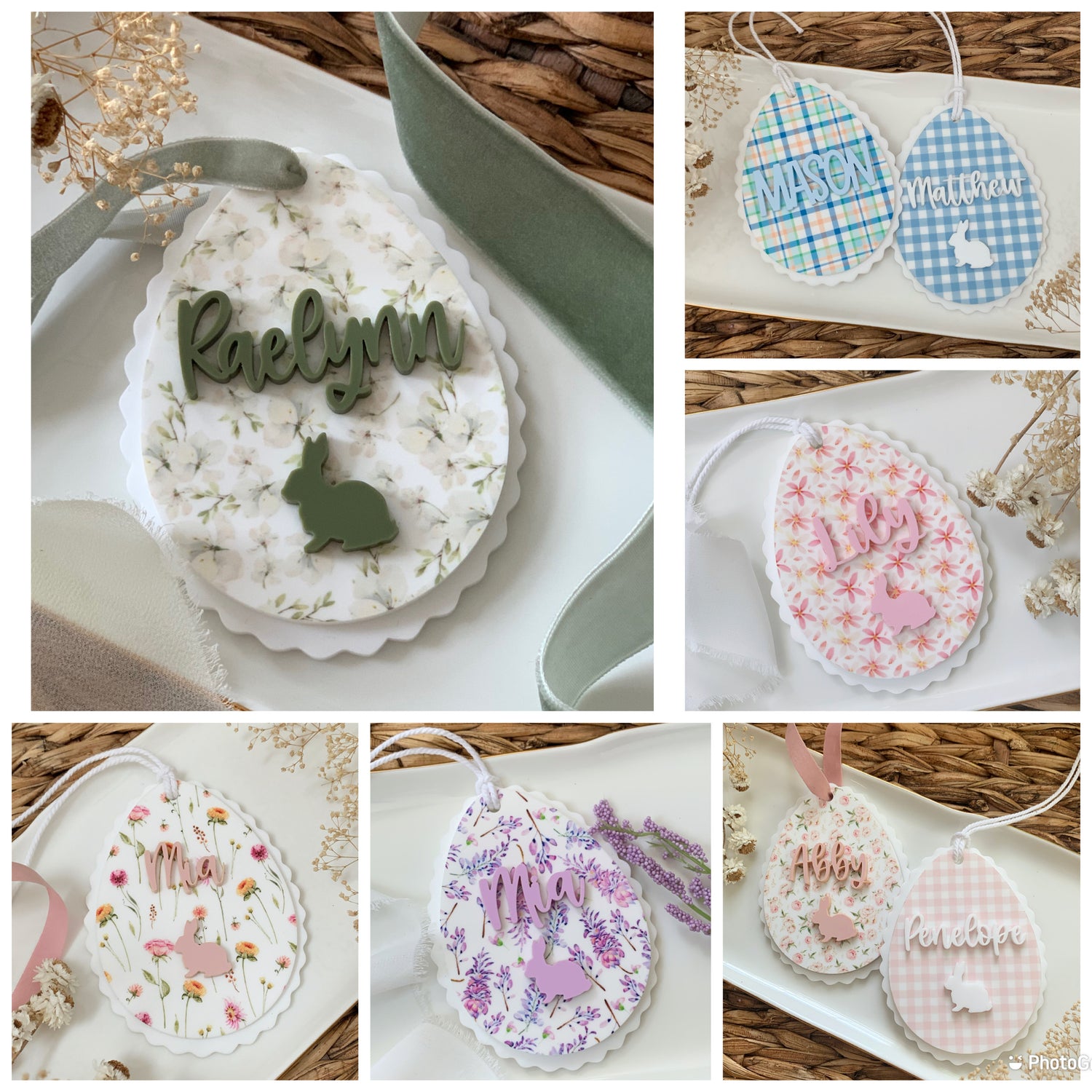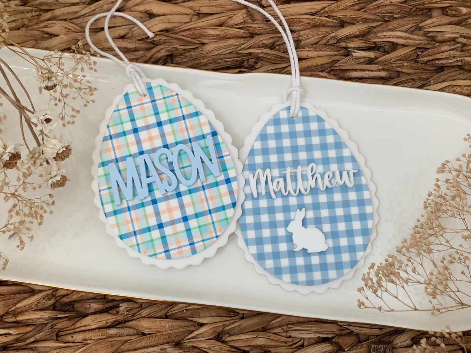 If you love a little bit of vintage, then check out these beautiful Scalloped Easter Egg tags with floral prints! We just added checkers and plaid to the collection as well! Each tag is made with acrylic. Please indicate in notes if you’d like a bunny on your tag or just the name.